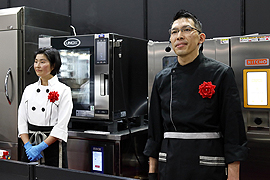 審査は、一般料理部門、デザート部門、行事食部門の順で決勝審査にノミネートされた各部門の2チームが、ステージにセットされたIHクッキングヒーターやスチームコンベクションオーブン、ブラストチラー、ミキサーなどを使って20分間の実演調理を行い、出来上がった料理を3名の審査員が試食・採点する方法で進められました。