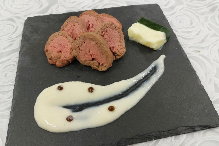 中華仕立てローストビーフ 白葱のポタージュソースと黒酢の雫